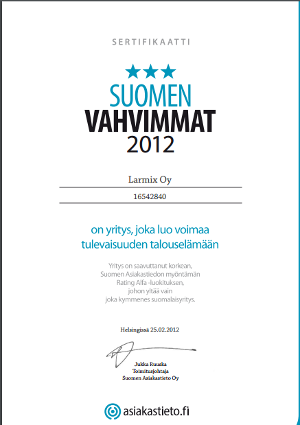 Larmix Oy kuuluu luottoluokituksessa AAA - ryhmään. Yrityksemme kannattavuus,
